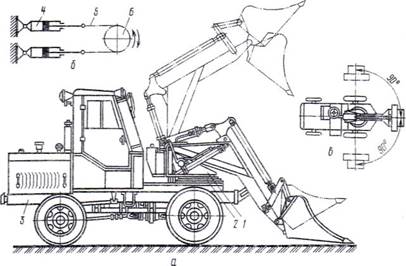 Одноковшовый фронтальный погрузчик (а) и схема его рычажно-гидравлической системы управления (б):