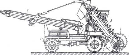 Пневмоколесный погрузчик: 1 - самоходное шасси; 2, 3 - ленточный и многоковшовый конвейеры; 4 - питатель; 5 - отвал