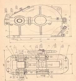 Редуктор состоит из зубчатой передачи, смонтированной на валах с подшипниками в литом чугунном корпусе. Корпус состоит из двух частей: нижней части – картера и верхней – крышки. Разъем горизонтальный, в месте соединения поверхности пришабрены, при окончательной сборке покрыты герметиком; собирают корпус без прокладок. Крышка с картером скрепляется болтами. Положение крышки относительно корпуса фиксируется двумя коническими штифтами, расположенными по диагонали.