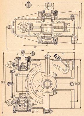 Ведущий вал-шестерня также установлен на двух радиальных шарикоподшипниках. Их регулировка осуществляется в случае необходимости также подбором прокладок под закладной крышкой подшипника. Смазка передачи осуществляется разбрызгиванием жидкого масла, заливаемого через смотровое отверстие в крышке корпуса. Уровень масла проверяют жезловым маслоуказателем. Отработанное масло спускают через отверстие, расположенное в нижней части корпуса. Это отверстие закрывается резьбовой пробкой, установленной с прокладкой.
