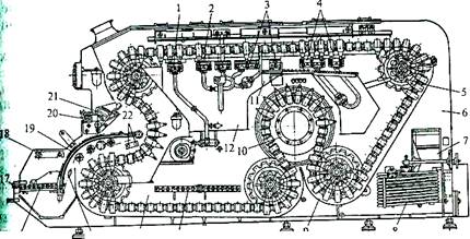 В нижних щелочных ваннах установлены теплообменники 8 и 13 для нагревания щелочных растворов и сетчатый барабан 7 для улавливания из раствора смытых этикеток. Воду в верхней водяной ванне нагревают паром через барботер. Механизм загрузки выполнен в виде ряда валиков 16, вращающихся в одном направлении. Вращаясь, валики стола загрузки переносят грязные бутылки с пластин-1 транспортера 17 к криволинейным направляющим 19, по которым поперечные планки 15 задвигают их в очередную кассету. В кассете помещается 16 бутылок.