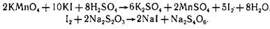 Параллельно определяют расход тиосульфата натрия на титрование контрольной пробы. Для этого в реакционный стакан наливают 370 см3 дистиллированной воды и смесь, состоящую из 25 см3 раствора перманганата калия концентрацией 0,1 моль/дм3 , 25 см3 дистиллированной воды и 50 см3 раствора серной кислоты концентрацией 4 моль/дм3 , предварительно отмеренных пипеткой в другой стакан. Стакан из-под смеси ополаскивают 30 см3 дистиллированной воды, которую также выливают в реакционный стакан. Затем сразу же добавляют цилиндром 10 см3 раствора иодида калия концентрацией 1 моль/дм3 и при непрерывном перемешивании оттитровывают выделившийся иод раствором тиосульфата концентрацией 0,2 моль/дм3 . Реакция должна протекать при температуре °С.