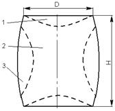 Бочкообразование тем больше, чем больше коэффициент трения μ на контактной поверхности. При горячей обработке давлением μ = 0,3 ÷ 0,4. При наличии сил трения τ на контактной поверхности и из-за подстуживающего действия инструмента деформации в заготовке распределяются неравномерно. В заготовке при осадке можно выделить три характерные зоны (рисунок 3, см. штриховые линии). Зоны затруднённой деформации 1 расположены с торцевых частей заготовки. В центральной части поковки расположена иксообразная зона интенсивной деформации 2. Частицы металла в этой зоне деформируются значительно больше, чем в зоне затруднённой деформации. Между боковой поверхностью заготовки и зоной интенсивной деформации находится зона промежуточных деформаций 3 с растягивающими напряжениями. [2]