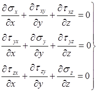В общем случае объёмного напряжённого состояния имеем три уравнения равновесия: