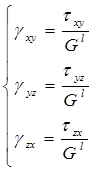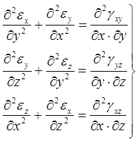 которые содержат шесть неизвестных – три нормальных и три касательных напряжений. Плюс шесть уравнений связи между напряжениями и деформациями:
