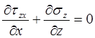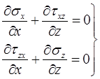 Выделим в теле бесконечно малый объём плоскостями, параллельными оси z на расстоянии x и x+dx от начала координат; длину этого объёма примем равной единице. (см. рисунок 6). На выделенный объём действуют нормальные напряжения σz, σx, σx+dσx и касательное напряжение τxz. Согласно второму допущению принимаем, что σz и σx не зависят от координаты z, т.е. постоянны по высоте и зависят только от координаты x. Тогда второе дифференциальное уравнение равновесия
