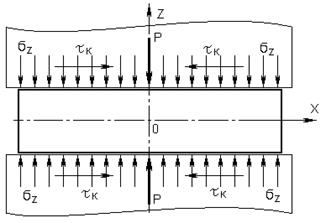 Если касательное контактное напряжение не зависит от нормальных напряжений, то разность нормальных напряжений – величина постоянная. В частных случаях, когда τк и τxz равны нулю (трение отсутствует), σxи σz являются главными напряжениями и выражение (15) превращается в уравнение (6):