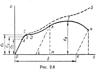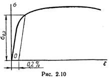 Как было отмечено выше, диаграммы растяжения для многих марок стали, а также сплавов, цветных металлов не имеют площадки текучести. Характерный вид диаграммы растяжения для подобных материалов показан на рис. 2.10.