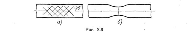 Как показывают исследования образцов стали, текучесть сопровождается значительными взаимными сдвигами кристаллов, в результате чего на поверхности образца появляются линии (так называемые линии Людерса — Чернова), наклоненные к оси образца под углом примерно 45° (рис. 2.9, а).
