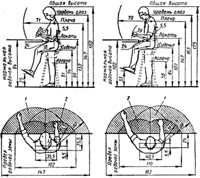 Внутренняя планировка рабочего места должна обеспечить такое оперативное пространство, при котором рабочий может свободно выполнять необходимые трудовые приемы и действия, размещать материальные элементы производства и формировать рабочие зоны с учетом зон досягаемости при различных рабочих позах, как в горизонтальной, так и в вертикальной плоскостях. Пределы досягаемости и нормальные зоны движений рук рабочего в горизонтальной и вертикальной плоскостях, а также оптимальные габаритные размеры рабочих мест для человека среднего роста, занятого выполнением различного рода работ, разработанные с учетом требований физиологии труда, приведены на рис. 1.