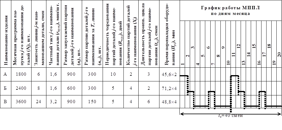 Стандарт-план МППЛ показывает чередование изделий на линии, время занятости линии изготовлением каждого изделия j-го наименования, режим работы линии в периоды, когда она работает со своими частными тактами при изготовлении изделий j-го наименования.