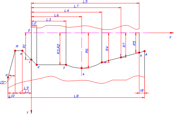 Расчет координат узловых и промежуточных точек фасонного профиля детали.