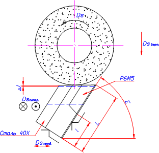 Принимаем по таблице для стали - А12 твердостью НВ=207 (4, стр.112,113) a=10°, g=23° т.к. a=8…12о, g=20…25о.