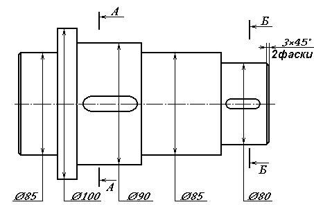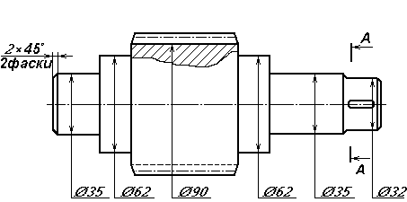 Коэффициент трения f=0.024 (стр.59 таб.4.4) Угол трения p`=1.3 Уточненное значение К.П.Д. редуктора =0.7726 Выбираем 8-ую степень точности Коэффициент динамической нагрузки Kv=1.4 (стр.65 таб.4.7) Коэффициент диформации червяка =108 (стр64. Таб.4.6) Вспомогательный коэффициент х0.6 (стр.65) Расчетное контактное напряжение н=146.802 Н/мм`2 Вывод: контактная выносливасть обеспечена, т.к. н<[н] Эквивалентное число зубъев zv=30 Коэффициент формы зуба YF=2.1 (стр.63 таб.4.5) Расчетное напряжение на изгиб F=7.702 Н/мм`2 Вывод: прочность зубьев червячного колеса обеспечена, т.к. F<[F] 2.3 Предварительный расчет валов Вращающий момент на ведущем валу передачи М2=93 Н*м Допустимое касательное напряжение [ ]=20 H/мм`2 Диаметр выходного конца ведущего вала db1=28.598мм Уточненный диаметр выходного конца ведущего вала db2=32мм Вращающей момент на ведомом валу передачи M3 =1944.9 Н*м Диаметр выходного конца ведомого вала db2=78.635 мм Уточненный диаметр db2=80 мм Диаметр ведомого вала под уплотнение: dу2=85 мм Диаметр ведущего вала под уплотнение: dу1 =35 мм Диаметр ведомого вала под подшипник: dn2=85 мм Диаметр ведущего вала под подшипник: dn1=35 мм Диаметр впадин витков червяка df1=90 мм Диаметр технологической ступени ведущего вала: dT1= 62 мм Диаметр под червячное колесо: dp2=90 мм Диаметр буртика ведомого вала: dб=100 мм Ведущий вал: | ||||||