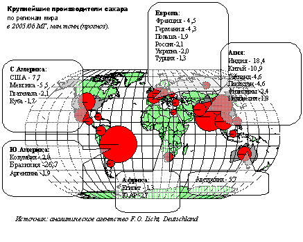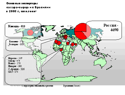 По оценкам департамента сельского хозяйства США мировое производство сахара в 2005/2006 маркетинговом году составит и 144,2 млн. т, товарооборот мирового рынка сахара - в размере $ 76 млрд. Не секрет, что лидировать на этом рынке, только с ещё большим отрывом от своих ближайших конкурентов будет Бразилия. Уже в этом 2005/06 маркетинговом году она обещает произвести около 40 млн. тонн сахара. С этим трудно поспорить, особенно, учитывая Гонконгский проигрыш ЕС. Попытки представителей ЕС и США "уличить" Бразилию в скрытом субсидировании сахарной отрасли, также потерпели неудачу.