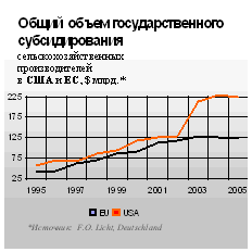 Конечно, претензии развивающихся стран были не беспочвенны. В странах Европейского союза до недавнего времени более половины всего бюджета поглощались субсидиями фермерам, что в абсолютных цифрах в 2005 году составило 114 € млрд. В США дотации фермерам также достигают колоссальных размеров. Если, так называемые в США “farm bills”, счета за оплату сельскохозяйственного производства, десять лет назад составляли примерно 60 $ млрд., то в настоящее время они выросли почти в 2,5 раза, поскольку в начале мая 2002 года американский конгресс принял, а президент Буш подписал новый закон, по которому начиная с 2002 года, субсидии сельскохозяйственным производителям США возросли на 60%, т.е. на 180 $ млрд. Кроме того, американским фермерам гарантируются твердые закупочные цены на уровне мировых, а внутренний рынок защищен от иностранных конкурентов высокими тарифами.