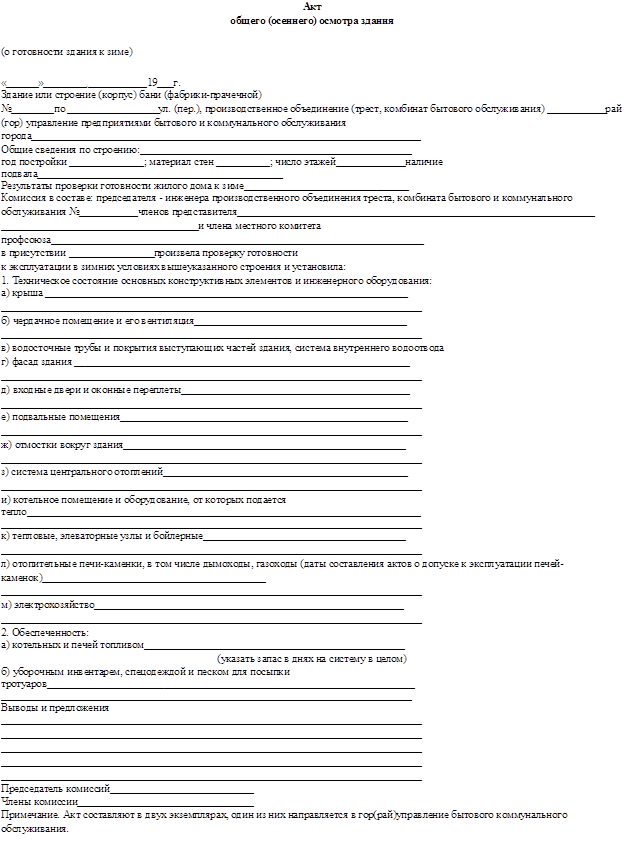 Осенний осмотр зданий производят до начала отопительного сезона для проверки их готовности к зиме с составлением акта (Приложение Б).