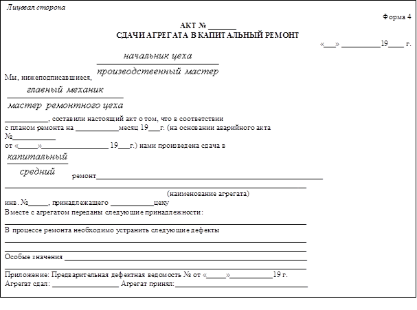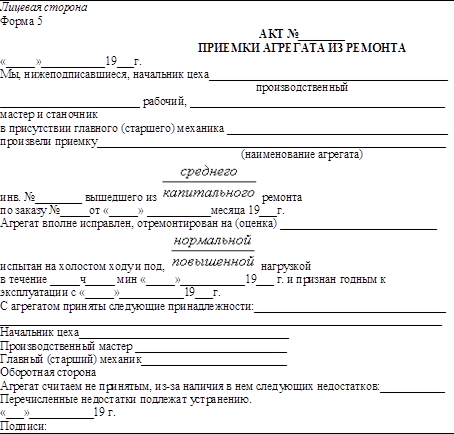 Сдача и приемка машины в ремонт и из ремонта производятся по актам (формы 14 и 15). При приемке машины из ремонта необходимо производить ее испытание в течение первой смены при нормальной загрузке.