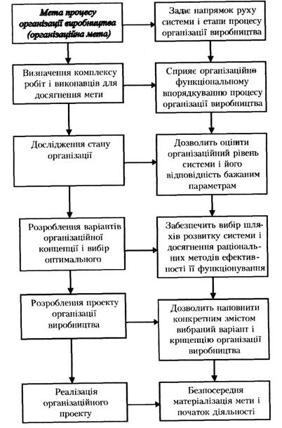 Організація виробничого процесу повинна охоплювати всі етапи діяльності підприємства: починаючи з підготовки виробництва до визначення процесів виготовлення і складання виробів та забезпечення процесу всім необхідним (матеріалами, трудовими ресурсами, устаткуванням, допоміжними процесами тощо).