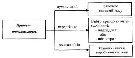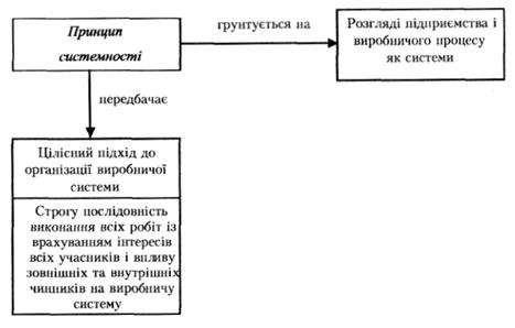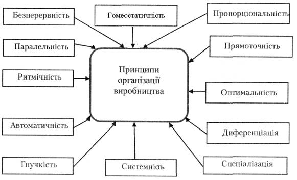Розподіл протікання процесу в часі, тобто техніко-економічне планування і, оперативне диспетчерування і регулювання ходу виробничого процесу, розподіл робітників за сферами діяльності (дільницях, цехах) і організація їх праці, виготовлення і реалізація готової продукції здійснюються на певних організаційних засадах, в основі яких лежать такі основні принципи: пропорціональності, безперервності, прямоточності, ритмічності, диференціації, спеціалізації, автоматизації, гнучкості, системності, оптимальності, гомеостатичності… (рис. 1.2.)
