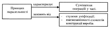 Принцип паралельності характеризує суміщення операцій і процесів у часі. В результаті цього скорочується час виготовлення продукції. Паралельність виконання робіт на окремому робочому місці досягається застосуванням багатоінструментальної обробки деталей. В межах дільниці, цеху, підприємства, паралельність забезпечується утворенням широкого фронту робіт з метою виготовлення окремих частин одного і того ж виробу та його складання, а також одночасним виготовленням різних виробів. Цей процес має особливо важливе значення при організації виробництва складних виробів, оскільки послідовне виготовлення їх складових зайняло б багато часу.