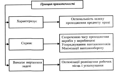Прямоточність - принцип раціональної організації процесів, який характеризує оптимальність шляху проходження предмету праці. Досягають принципу прямоточності за допомогою розміщення цехів, дільниць і робочих місць відповідно до послідовності протікання технологічного процесу.