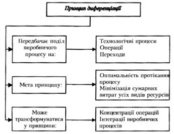 Принцип диференціації передбачає поділ виробничого процесу на окремі технологічні процеси, операції, переходи, забезпечуючи оптимальність їх протікання та мінімізацію сумарних витрат усіх видів ресурсів.