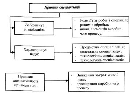 Принцип спеціалізації ґрунтується на обмеженні розмаїття елементів виробничих процесів. Зокрема, виділяються групи робітників, які спеціалізуються за професіями, тобто на виконанні відповідних технологічних операцій.