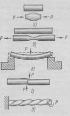 а — сжатия, б — растяжения,в —изгиба,