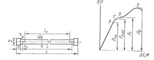 Определение прочности на растяжение — наиболее важный и распространенный вид механических испытаний материалов (ГОСТ 1497—73). Образцы определенном формы м размеров испытывают на специальных разрывных машинах. Стандартный образец (рис. 2) закрепляют головками диаметром D в машине и медленно нагружают с постоянной скоростью. В результате возрастающей нагрузки происходит растяжение образца вплоть до разрушения по диаметру d 0 . При испытании производится автоматическая запись диаграммы растяжения (рис. 3), представляющей собой графикизменения длины образца А в зависимости от приложенной нагрузки Р. Определенные точки на диаграмме растяжения р, с, s , Ъ отражают наиболее важные характеристики прочности: предел пропорциональности, условные пределы упругости, текучести и прочности.