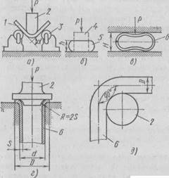 а — на изгиб, б — на осадку, в — на сплющивание труб, г — на бортование труб, д — на загиб труб; 1 — образец, 2 — оправка, 3 — ролики,