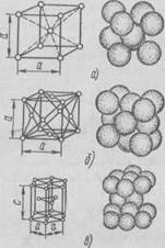 а—объемно-центрированная кубическая (ОЦК). б — гранецент-рированная кубическая (ГЦК). в — гексагональная плотноупа-кованная (ГПУ)