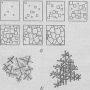 Все металлы и сплавы имеют кристаллическое строение. В процессе кристаллизации положительно заряженные ионы, располагаясь последовательно в виде элементарных кристаллических решеток, образуют кристаллы в виде зерен (Рис. 8, а) или дендритов1 (Рис. 8,б). Образующиеся кристаллы растут, кристаллизуются из жидкого расплава сначала свободно, не мешают один другому, потом они сталкиваются и рост кристаллов продолжается только в тех направлениях, где есть свободный доступ жидкого металла. В результате первоначальная геометрически правильная форма кристаллов нарушается. В закристаллизовавшихся металлах и сплавах зерна и ден-дриты имеют неправильную, геометрически искаженную форму.