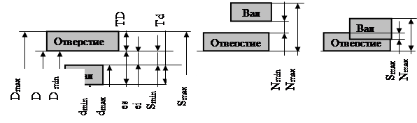Зазор S - разность размеров отверстия и вала, если размер отверстия больше размера вала. Наибольший, наименьший и средний зазоры определяют по формулам