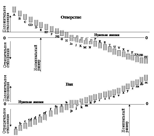 Основное отклонение (положение поля допуска относительно нулевой линии), зависящее от нормального размера, обозначается буквой латинского алфавита — прописной для отверстий (от А до Z) и строчной - для валов (от а до z) На рис. 2.3 приведены основные отклонения отверстий и валов в системах ИСО и ЕСДП.
