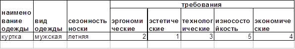 При выборе материала для изготовления куртки летней мужской прогулочной необходимо распределить ранговую зависимость к требованиям (табл.1)