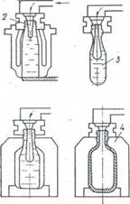 1 - дутьевая головка; 2 — керн; 3 — набор стекла; 4 — форма. Производительность ручного выдувания составляет 400—900 изделий в смену на бригаду из 6—10 человек.