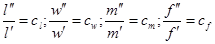 Обозначая отношение расстояний между геометрически подобными точками, т.е. сходственных отрезков длин двух подобных систем, через сl, скоростей – сw, масс – сm, сил – сf и т.д., можно дать математическую формулировку понятия подобия в виде следующей системы равенств: