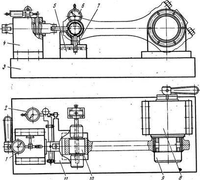 В верхнюю головку шатуна вставляют установочный палец 10, надевают шатун отверстием нижней головки на базовый палец 9 и кладут выступающими поверхностями установочного пальца 10 на упор 7.