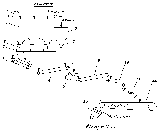 Холодные окатыши имеют высокую прочность, что позволяет их транспортировать на большие расстояния к доменным цехам. Принципиальная схема технологического процесса представлена на РИС. 1. Концентрат, известняк и возврат поступают в бункера 1, откуда питателями 2 в определенных соотношениях выдаются на конвейер 3, направляющий шихтовые материалы в смесительный барабан 4, по выходе из которого шихта конвейером 5 транспортируется в гранулятор 6. Перед окомкователем к шихте добавляют бентонит, подаваемый из бункера 7 питателем 8. В окомкователе происходит образование окатышей, чему в значительной степени способствует вода, подаваемая в гранулятор через распыляющую форсунку. Выходящие из окомкователя сырые окатыши транспортируются конвейером 9 к укладчику 10. С помощью укладчика окатыши подаются в питатель 11, который загружает их на машину 12 упрочняющего или упрочняюще-восстановительного обжига. После охлаждения готовые окатыши перед отправкой на склад подвергаются рассеву на грохоте 13.