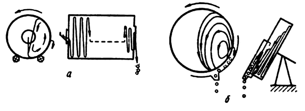 На РИС. 2 изображены схемы процессов образования окатышей в барабанном (а) и чашевом (б) грануляторах.