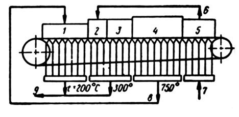 1 – зона сушки; 2 – зона нагрева; 3 – первая зона обжига; 4 – вторая зона обжига; 5 – зона охлаждения; 6 – отходящие газы в зону нагрева; 7 – подсос холодного воздуха из атмосферы; 8 – отходящие газы в зону сушки; 9 – отходящие газы в дымовую трубу.