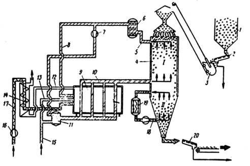 Упрочненные и восстановленные окатыши в нижней половине печи (зона II) охлаждают в противопотоке холодного газа, подаваемого в печь газодувкой 18. Охлаждающий газ циркулирует в замкнутом контуре, в состав которого входит скруббер 19.