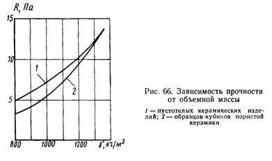 а между прочностью пустотелых изделий R`сж и их объемной массой (брутто) g` отмечается зависимость вида квадратичной параболы (рис. 66)