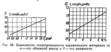 Теплопроводность керамических материалов зависит от их объемной массы (рис. 68, а), состава, вида и размера пор и резко возрастает с увеличением их влажности (рис. 68, б), так как теплопроводность воды [l= 0,58 Вт/(м-град)] выше теплопроводности воздуха