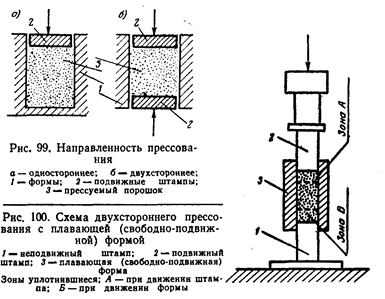 На равноплотность прессовки очень большое влияние оказывает режим прессования. По направленности прессовых усилий различают прессование одностороннее (рис.99,а) и двусторонние (рис.99,б), по кратности их приближения– однократное и многократное прессование, по интенсивности приложения—ударное и плавное прессование.