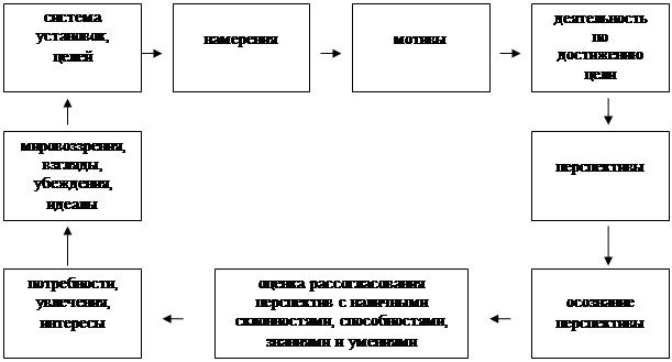Как показано на этой модели, потребности, увлечения и интересы студента возникают на основе осознания перспектив и адекватной оценки степени рассогласования требований перспектив с наличными склонностями, знаниями и умениями. На основе общезначимых перспектив формируются мировоззрения, взгляды, убеждения и идеалы, система целей и установок, намерения. Перспективы выступают в данном случае в качестве отдельной цели студента.