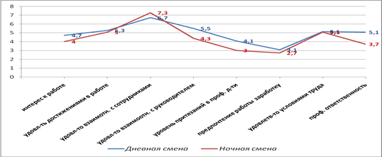 1. Удовлетворенность различными аспектами и условиями труда в дневной и ночной сменах неодинаковая.