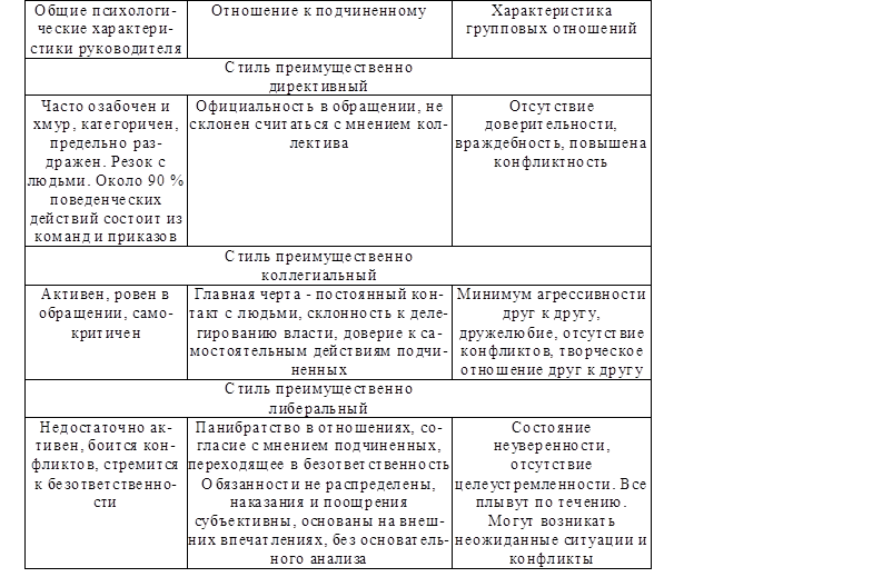 Для директивного стиля характерно жесткое единоначалие, а также слабый интерес к работнику как к личности. При коллегиальном – руководитель стремится к выработке коллективных решений, демонстрируя при этом интерес к неформальному, человеческому аспекту отношений. Либеральный означает полную устраненность руководителя от дел коллектива.