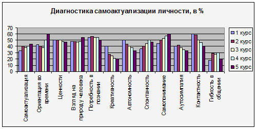 3) стремление к самоактуализации в наибольшей степени выражено у студентов пятого курса, что проявляется в таких компонентах, как ориентация во времени, взгляд на природу человека, потребность в познании и самопонимание.